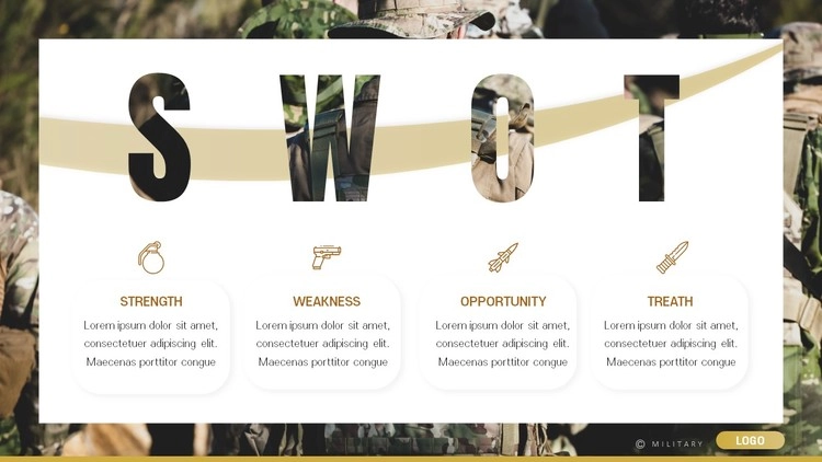 페이지 내부에 무기 아이콘 개체, 군인 이미지, 계급 체계도 및 조직도 디자인, 전쟁 무기, SWOT 분석 자료, 일정표 및 계획표 디자인 등 다양한 레이아웃을 활용할 수 있습니다.