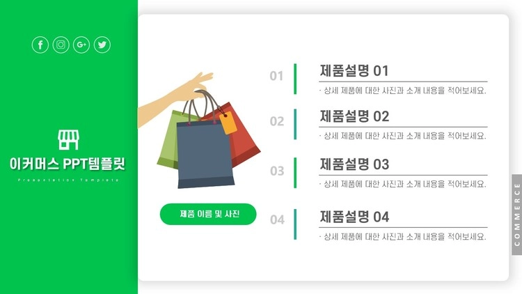 이커머스 및 전자상거래, 온라인 쇼핑몰 상세페이지 디자인, 제품 및 상품 소개, 가격 비교, 고객 구매 분석, 트렌드 분석 등 다양한 주제로 PPT 디자인을 완성할 수 있습니다.