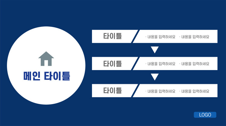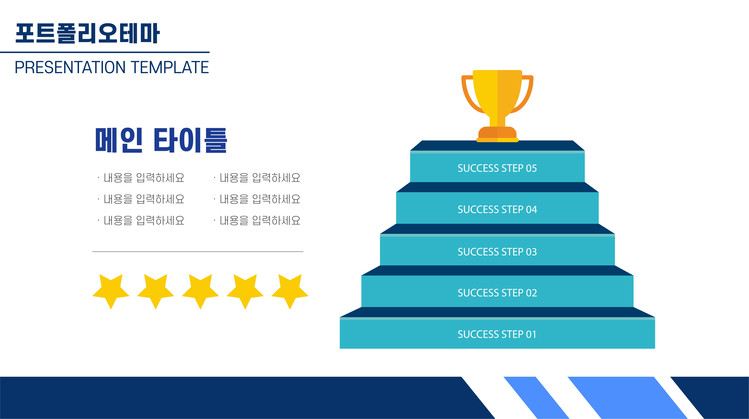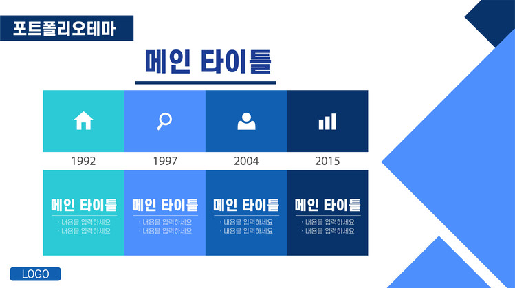 내부 슬라이드에는 파랑색, 남색 색 조합 도형 디자인 구성으로 제작했으며 다각형 도형 개체 위주로 페이지를 구성했습니다.