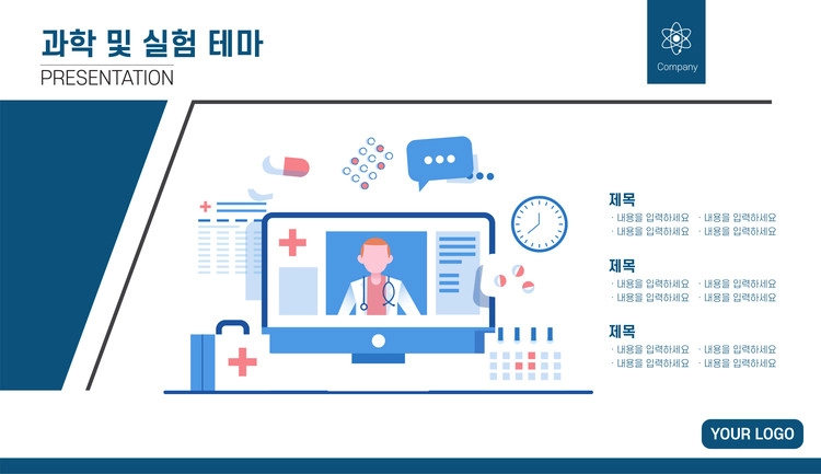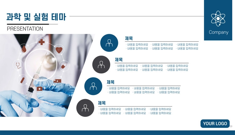 내부 슬라이드에 과학 관련 이미지 자료로 구성했으며 실험 픽토그램 일러스트 아이콘 디자인을 통해 세부 디자인을 꾸몄습니다.