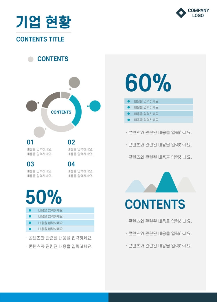 파랑색 색 조합 구성을 활용하여 레이아웃을 제작했습니다. 내부 페이지 디자인으로는 도표 개체, 인포그래픽 디자인, 무료 저작권 이미지 사이트 자료를 활용하여 페이지를 구성했습니다.