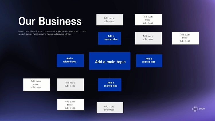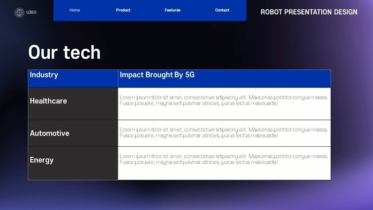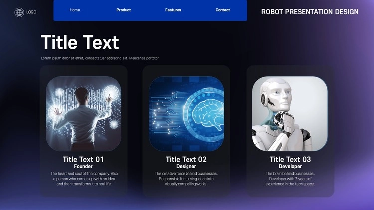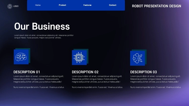 보라색 색 조합 계열로 전체 레이아웃 디자인을 작업했으며 로봇 관련 샘플 이미지와 아이콘 디자인 모음으로 슬라이드를 제작했습니다.